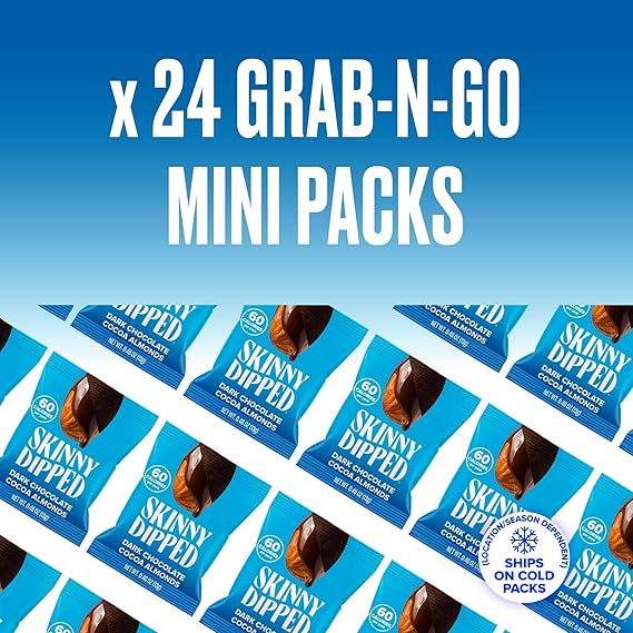• PERFECT PORTIONS: Best enjoyed anytime, anywhere. Dive in! Each mini bag is 60 calories and is sized to be the ideal on-the-go snack. This pack includes (24) 0.46 oz bags of SkinnyDipped Dark Chocolate Cocoa Almonds.